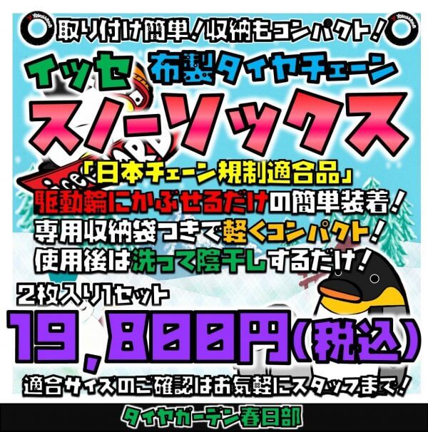 『予算的にスタッドレス購入は難しいけど、急な降雪には備えておきたい』という方はゼヒゼヒ☆