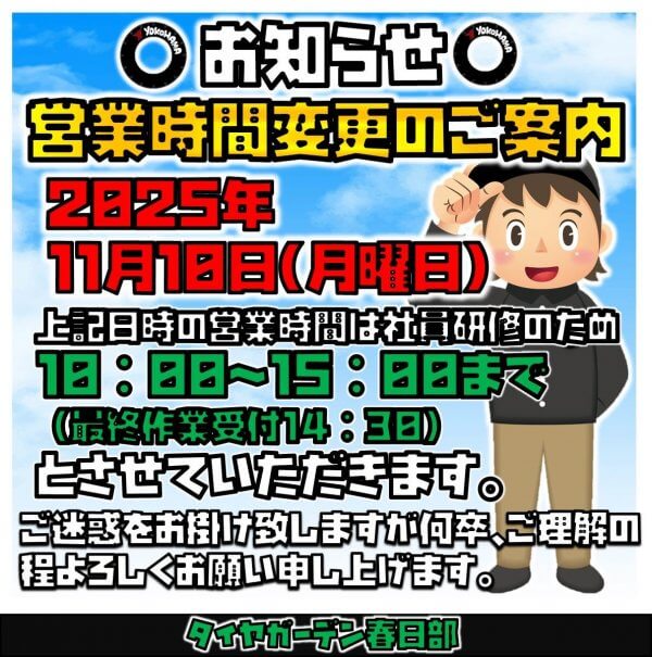恐縮ではございますが『11月19日(月曜日)』の営業時間は『10:00~15:00まで(作業受付14:30まで)』とさせていただきます。