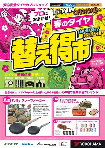 当店でヨコハマタイヤを4本以上お買い上げのお客様にその場で豪華景品プレゼント!