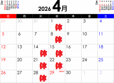 4月 店休日のお知らせ