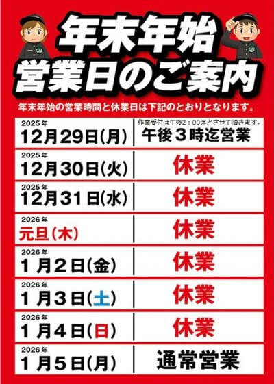 年始は1月5日AM10:00より通常営業開始となりますので、お願いいたします。